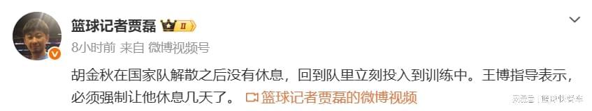 而在结束男篮世预赛后,胡金秋也跟随中国队回到北京,并且各自解散回家。在离开国家队以后,胡金秋并没有偷懒,也没有选择休息,直接就回到了球队,跟随球队一起训练。而对于胡金秋这种劳模精神,作为广厦主教练王博,他已经心疼坏了。毕竟,广厦队目前就只有胡金秋这样一个顶尖内线,一旦他受伤了,对于广厦而言,确实是灭顶之灾。